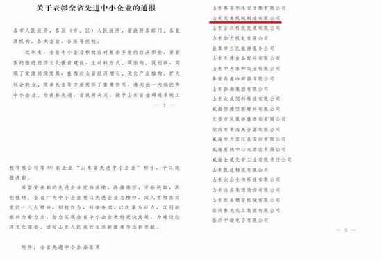 山東天意機(jī)械被評(píng)為全省先進(jìn)中小企業(yè)表彰鏈接:http://www.smesd.gov.cn/view/zhongyaotongzhi/315751.html