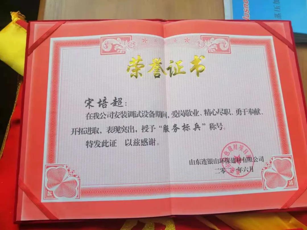 炎炎夏日,天意機(jī)械在向客戶山東連銀山環(huán)保建材有限公司售出保溫裝飾一體化板生產(chǎn)線之后,隨即派出售后團(tuán)隊對設(shè)備進(jìn)行安裝調(diào)試及售后培訓(xùn)。售后團(tuán)隊不畏酷暑,精心、耐心、專業(yè)地為客戶進(jìn)行安裝調(diào)試,贏得了客戶的好評和認(rèn)可,客戶為表達(dá)謝意,特授予天意機(jī)械售后人員榮譽(yù)證書和錦旗,以表彰售后人員愛崗敬業(yè)、精心盡職、勇于奉獻(xiàn)、開拓進(jìn)取的精神。